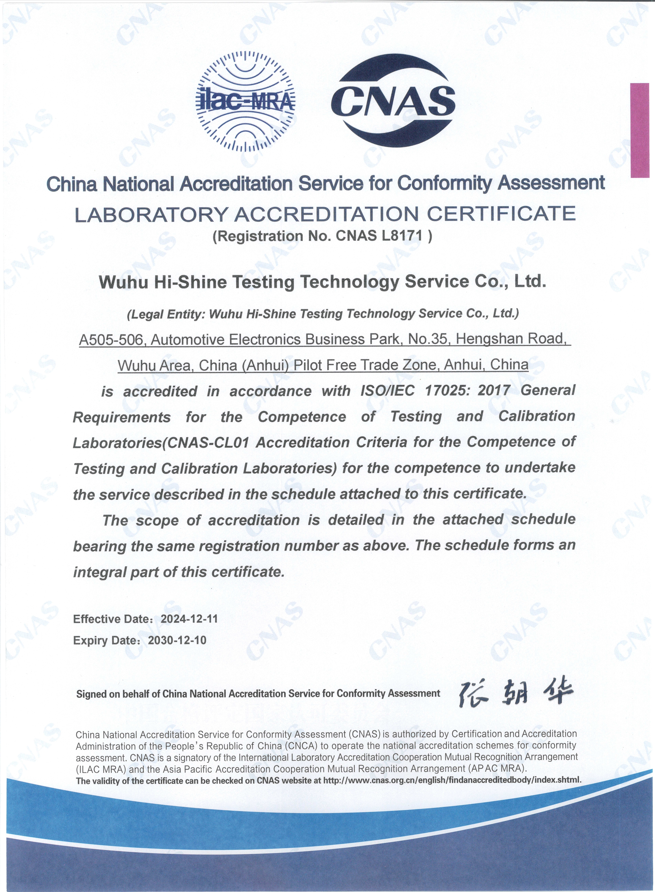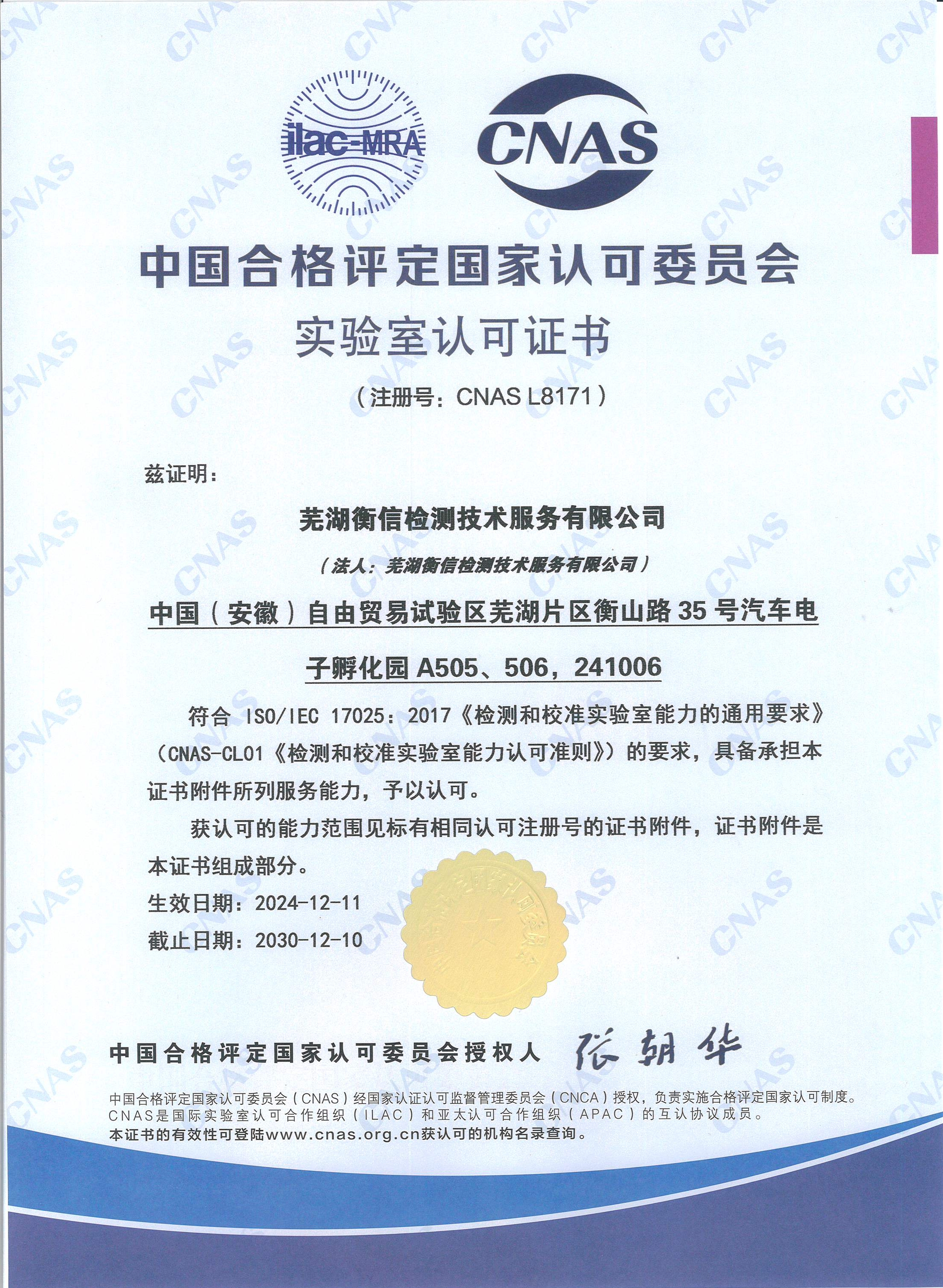 蕪湖衡信于2015年11月通過了中國合格評定國家認(rèn)可委員會(CNAS)的校準(zhǔn)和檢測實驗室認(rèn)可(證書號:CNAS L8171),現(xiàn)有CNAS認(rèn)可校準(zhǔn)能力220項,可在幾何量、熱學(xué)、力學(xué)、電學(xué)、化學(xué)等多個領(lǐng)域為廣大企事業(yè)單位提供第三方計量校準(zhǔn)技術(shù)服務(wù)。